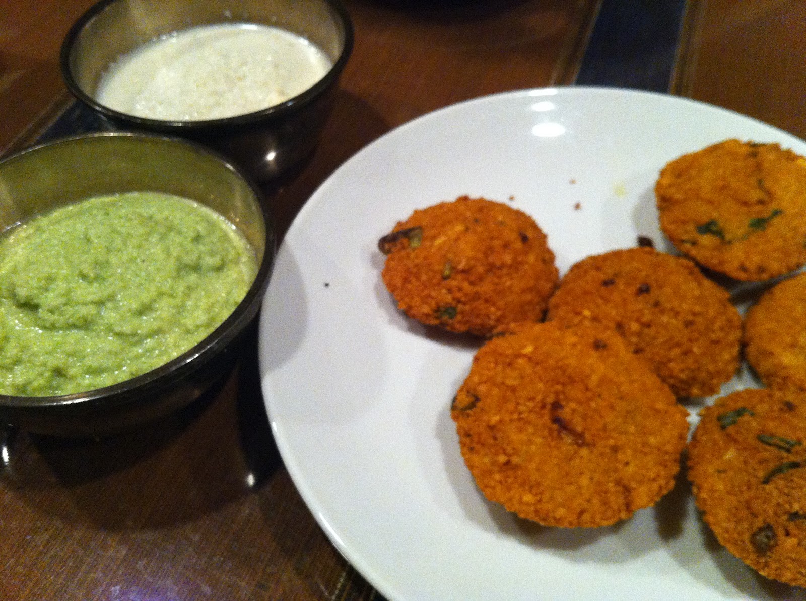 マサラワダとココナッツチャトニ2種(プレーンとグリーン(青唐辛子、コリアンダー))