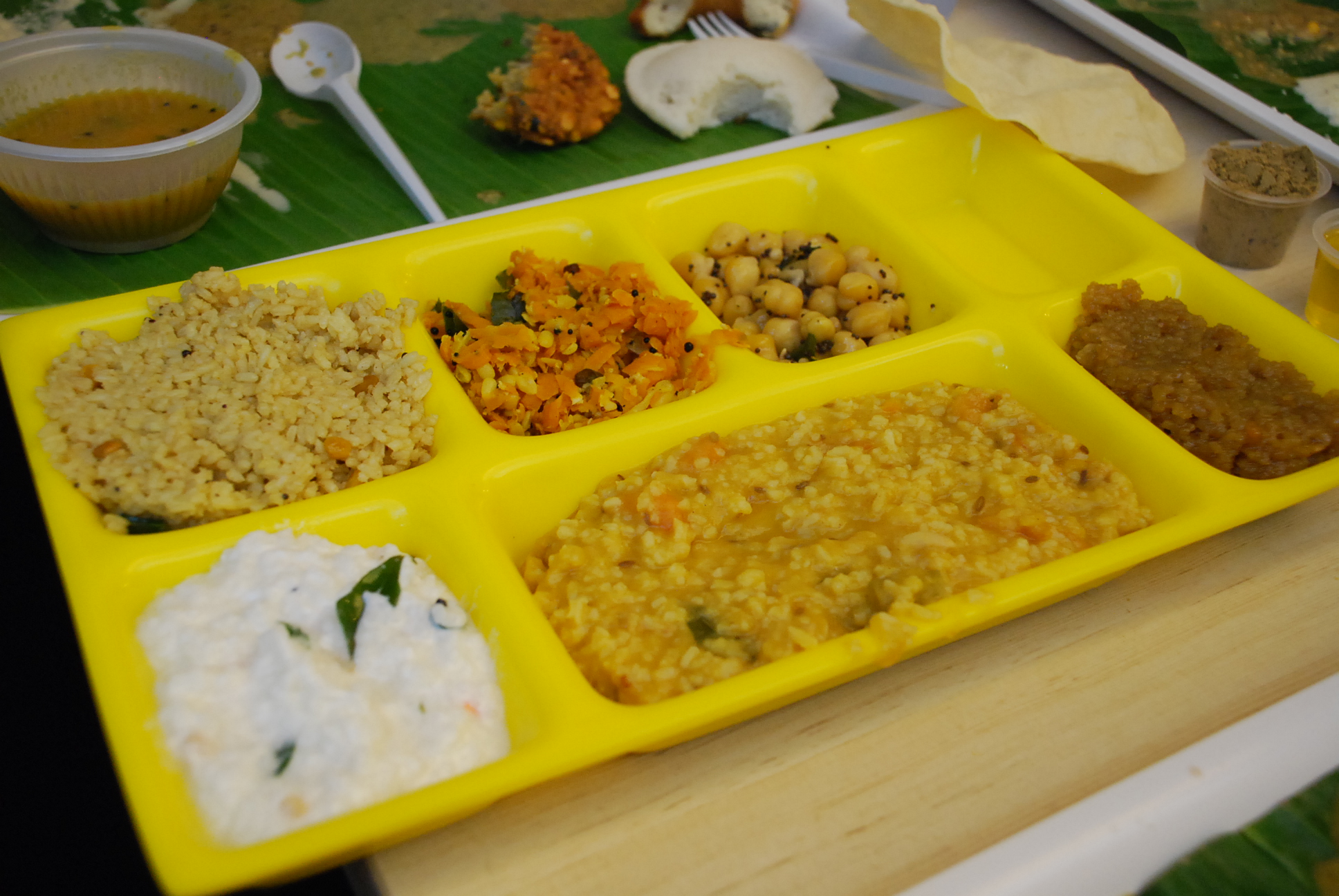 イドゥリ、メドゥ・ワダ、マサラ・ワダ、サンバル、チャトニ4種。
