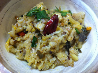 冷凍庫にあった青バナナを茹でて、皮をむき、摩り下ろし・・・、温めたフライパンに、油を注ぎ、マスタードシード・ウラドダル・チャナダル・・・