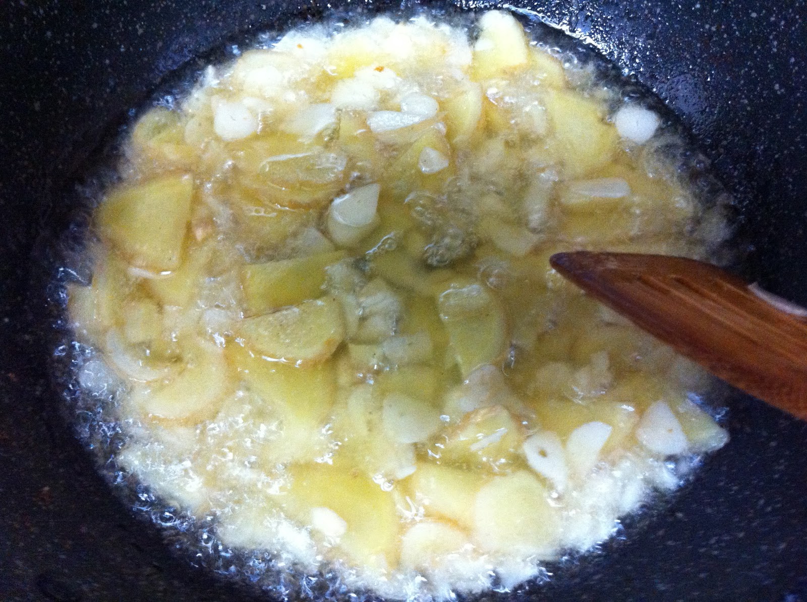 まずは、にんにくと生姜のスライスをごま油でカリカリ手前まで炒めます。
