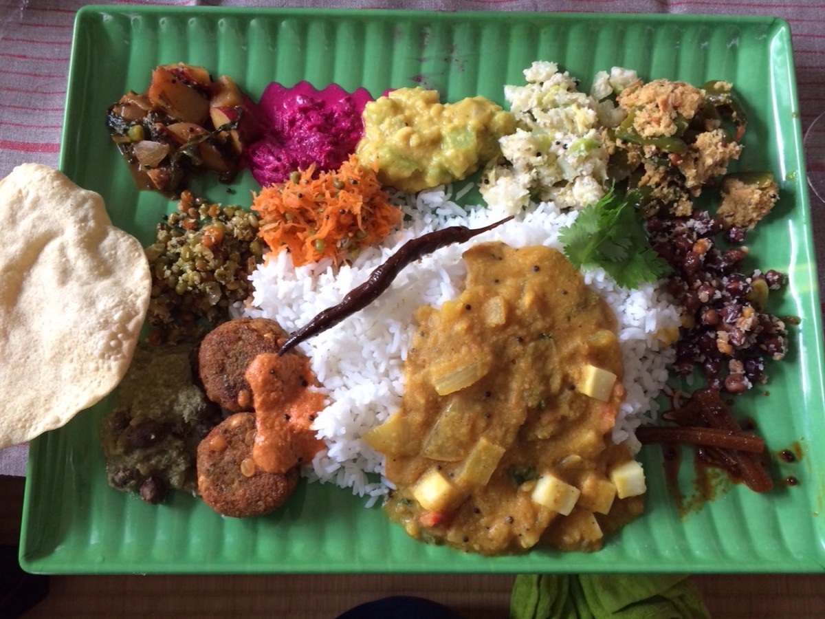 蕪と人参のサンバル、ラッサム、里芋とロビア豆のクートゥ、ムングダールホール(緑豆)のポリヤル、レモンのアチャール、