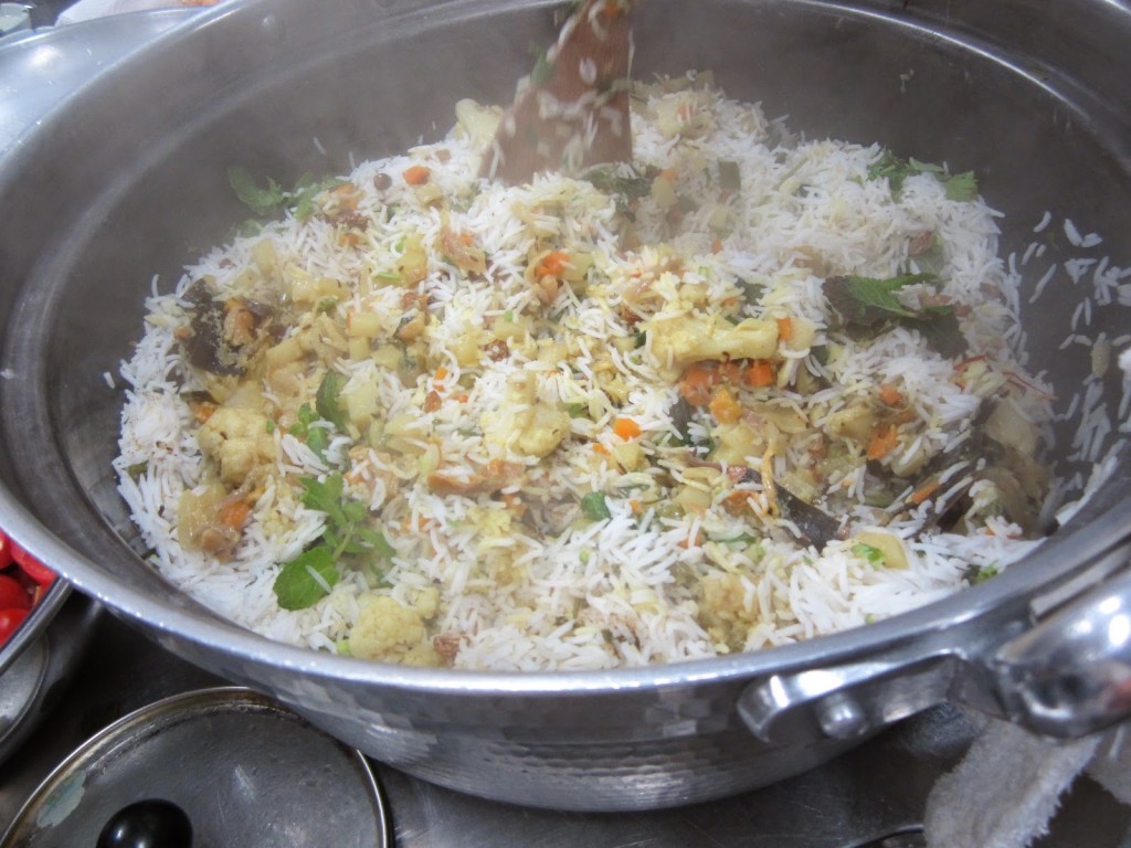 ⑪Hyderabadi vegetable biryani 炊きすぎたビリヤニ。具材は、カリフラワー、にんじん、ズッキーニ、マッシュルーム、ジャガイモを使用しました。本当は、グリーンピースも入れるつもりでしたが、会場の冷凍庫で冬眠していたことが片付け途中わかりました><;