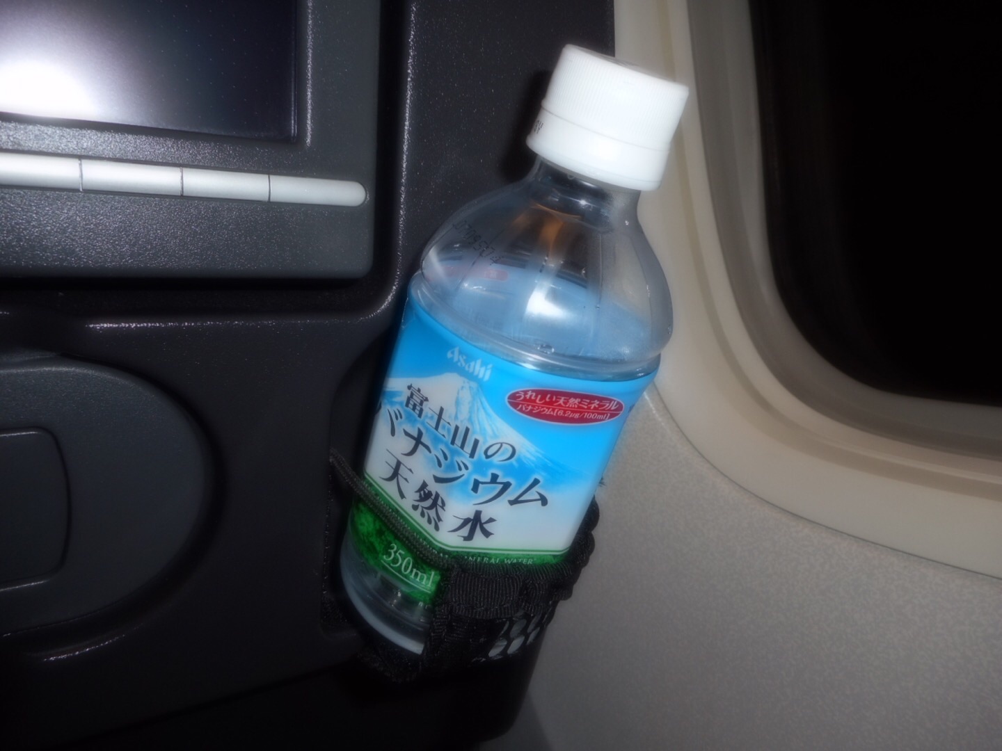 話を戻します。機内で、まずペットボトルの水「アサヒ飲料 富士山のパナジウム天然水」がウェルカムドリンクとして配られました。