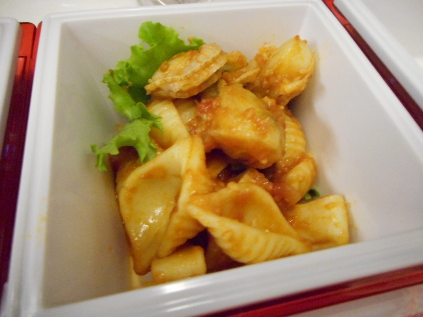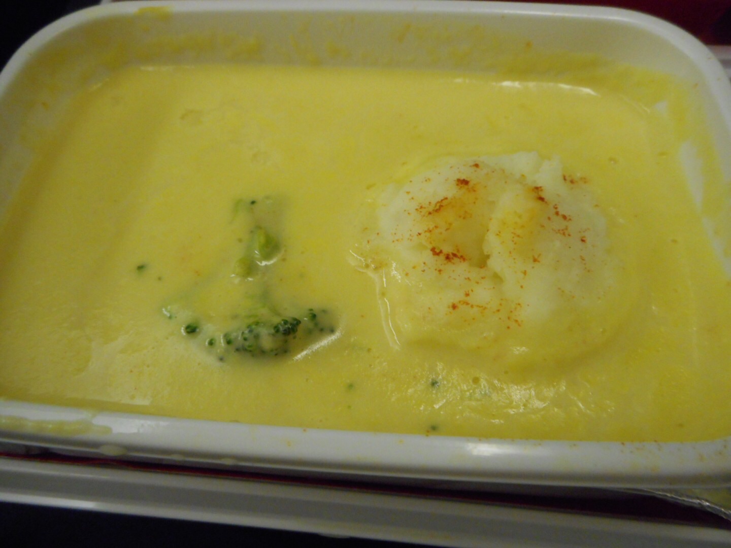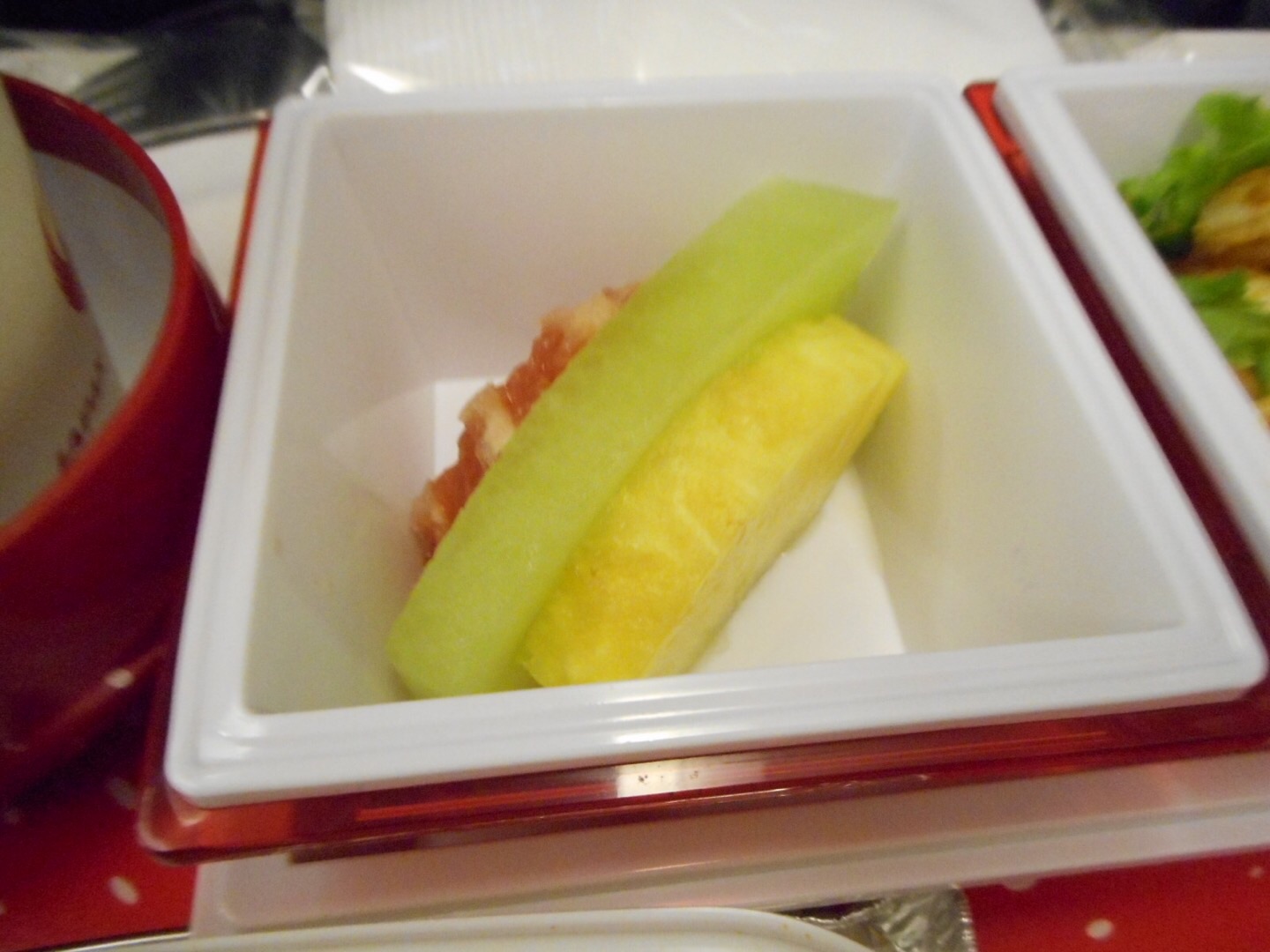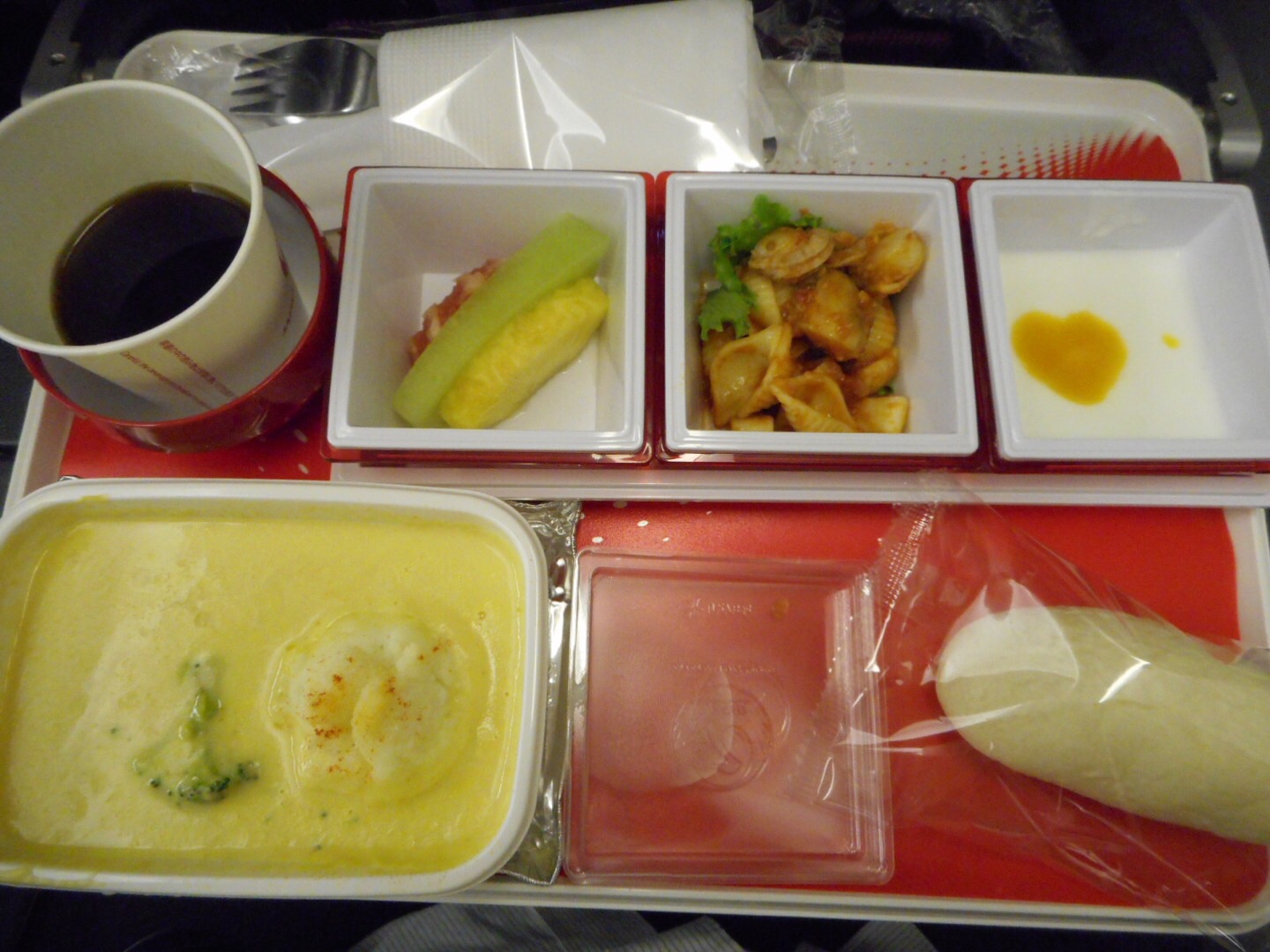 機内食は、マッシュポテトクリームソース添え?、コンキリエのトマトソース煮?、パン、西瓜・パイナップル、ヨーグルトでした。コンキリエが冷めきっていたのは残念でした。