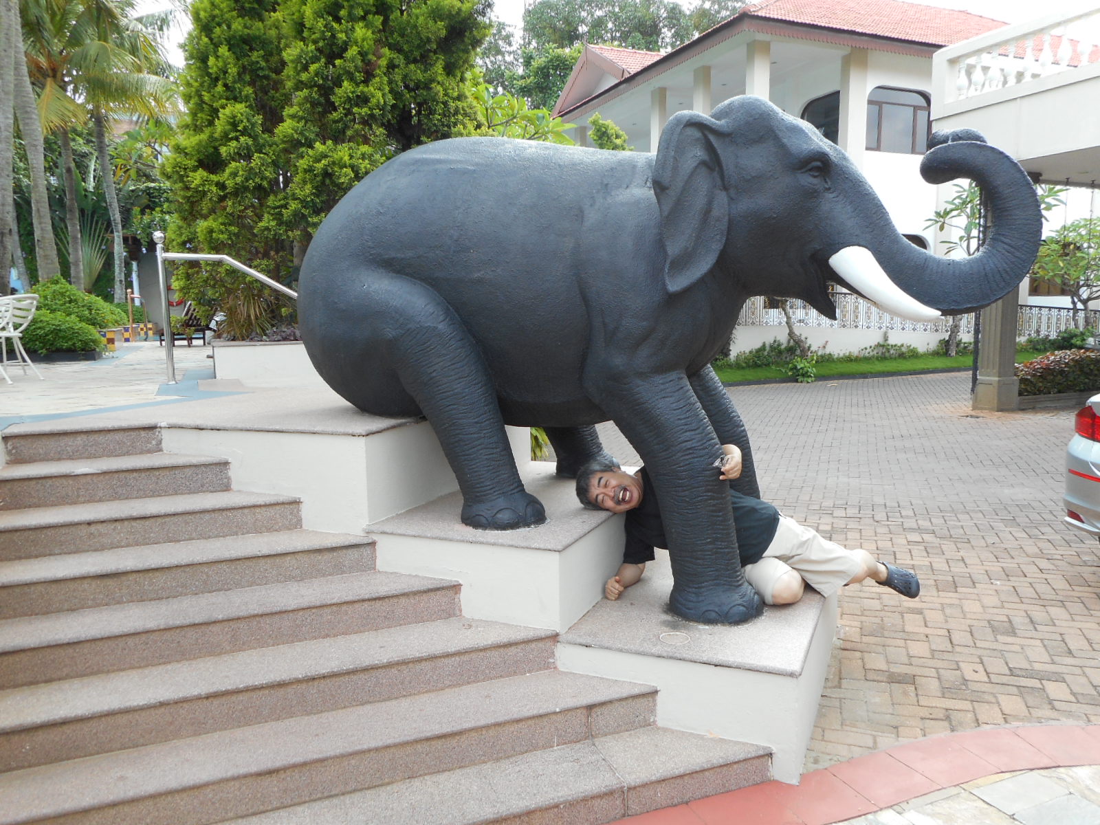 ブログの更新がままならないため、東京都大田区「ケララの風Ⅱ」店主 N-jiriさんが石”象”と戯れている写真をUPしておきます。