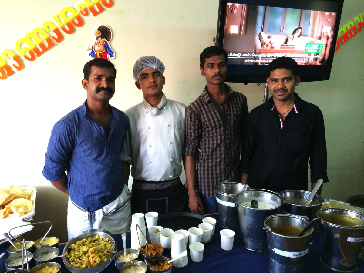左側を見ると、Sadyaを食べに来たお客さんたちがジロジロ?見て笑っています。