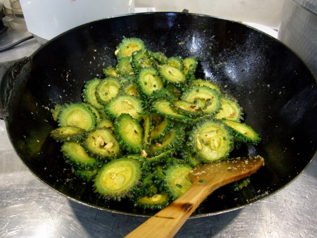 ゴーヤを輪切りにし、ターメリックをまぶし、ちょっと多めの油で炒め揚げしました。