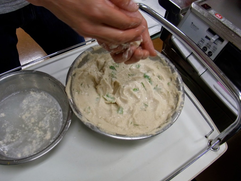 初めは、おっかなびっくり。でも、慣れると上手に揚げて頂きました。