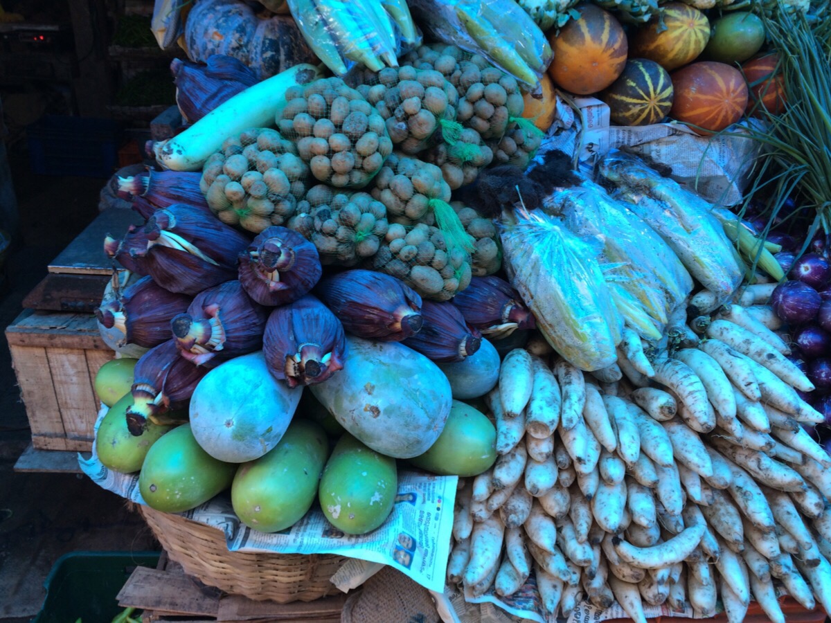 個人的には、下の写真の女性の右わきのブルーシートに置かれているエレファント・ヤムを購入して持って帰りたかったのですが、検疫で引っ掛かりそうなのでやめました。