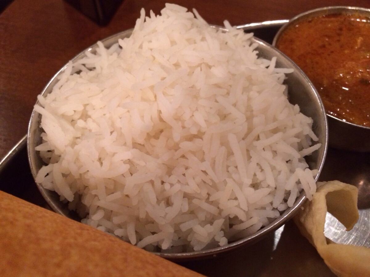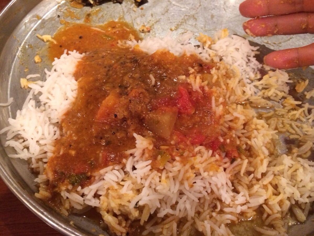 サンバル、ラッサム、バスマティライス1つが運ばれてきましたので、こちらもエンジン全開で食事にかかります。