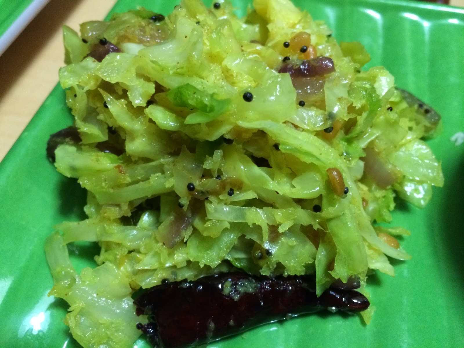 キャベツのトーレン マスタードシードを爆ぜさせ、赤唐辛子、カレーリーフ、ウラドダルを投入。ダルが色付いたら、ヒング少々入れました。赤玉ねぎも入れて軽くお塩。しんなりしたらターメリックパウダー入れてかき混ぜます。レッドチリパウダー入れてかき混ぜ、キャベツ投入。蒸し焼きにしてココナッツ投入し塩味調整して完成です。