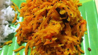 白菜のクートゥ 下茹でした白菜にトゥールダルをまぜ、ココナッツ、青唐辛子、クミンシードで風味付け。