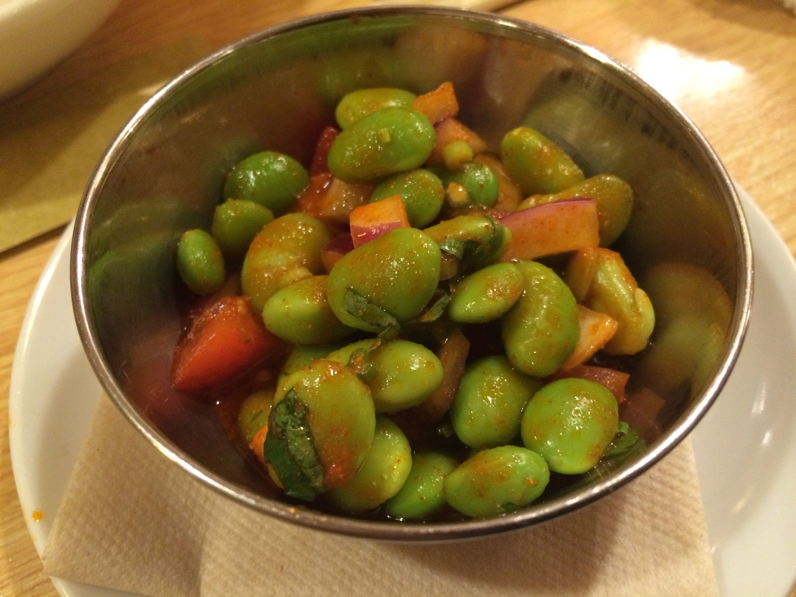 枝豆をトマト、玉葱、香菜、塩、レッドチリパウダーでマリネした物。