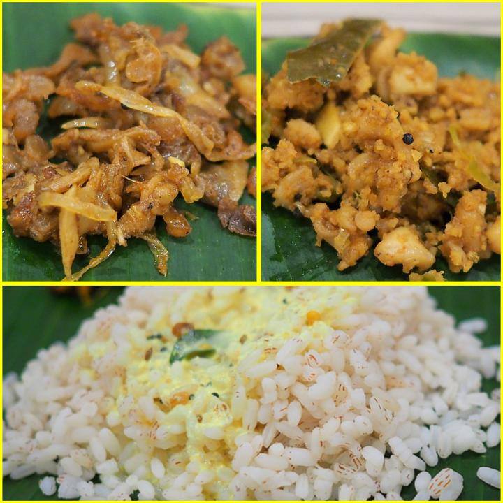 貝も烏賊も料理に使ったことはあるけれど、ここまで細かく刻んだことはありませんでした。なんだか佃煮みたいですが、まさにそんな感じの二品、まるまるとしたケララ赤米に濃い目の(塩がではなく)味付けされたヨーグルトのグレービーが食を進めさせます。