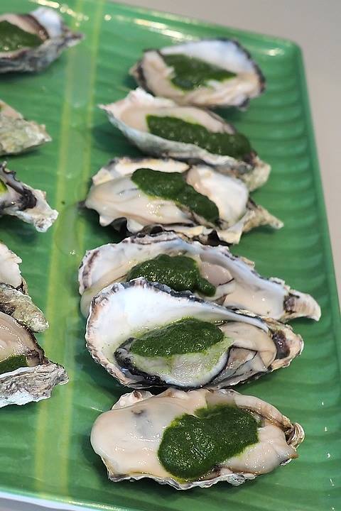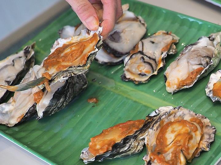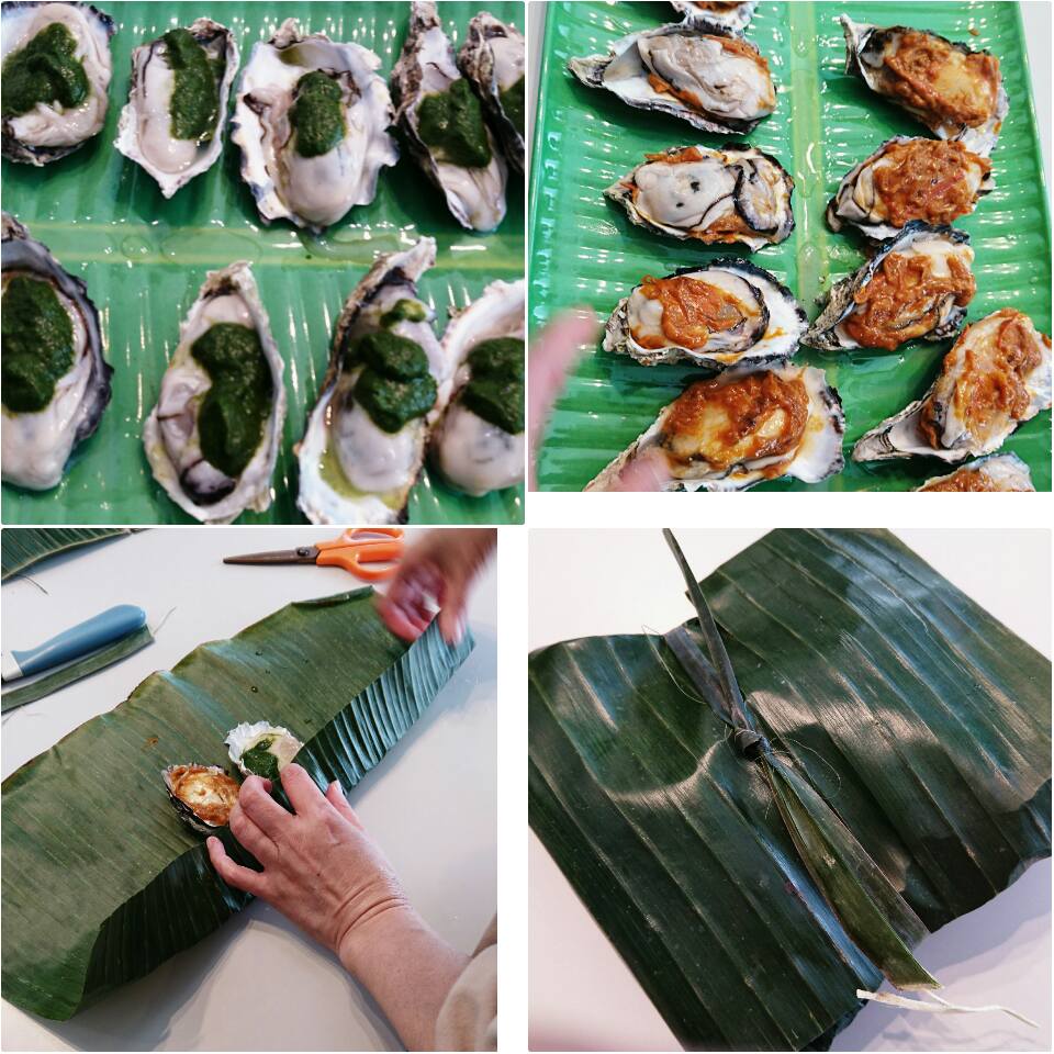 1、バナナの葉を焼いていただき、牡蠣殻に牡蠣を載せ、2種のペーストを添えていただき、焼いたバナナの葉で牡蠣を包んでいただく