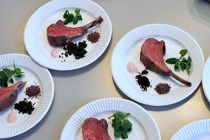 3、低温調理のラムチョップのカレーリーフポディ添え(塩味はヒマラヤピンク岩塩と黒岩塩をお好みで使用していただきました。)