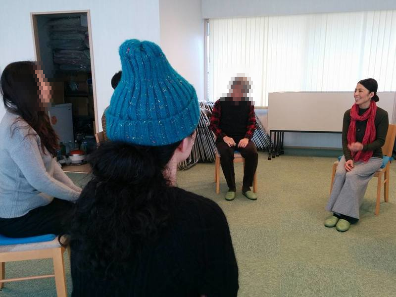 会場スペースにはゆとりがあることから、簡単にできるヨガを食事前にやりましょう!ということで、ご自身のサロン(Lotus Garden)をお持ちの佐藤恵さんが講師となり椅子を使って30分程のヨガをみなさんに体験して貰いました。