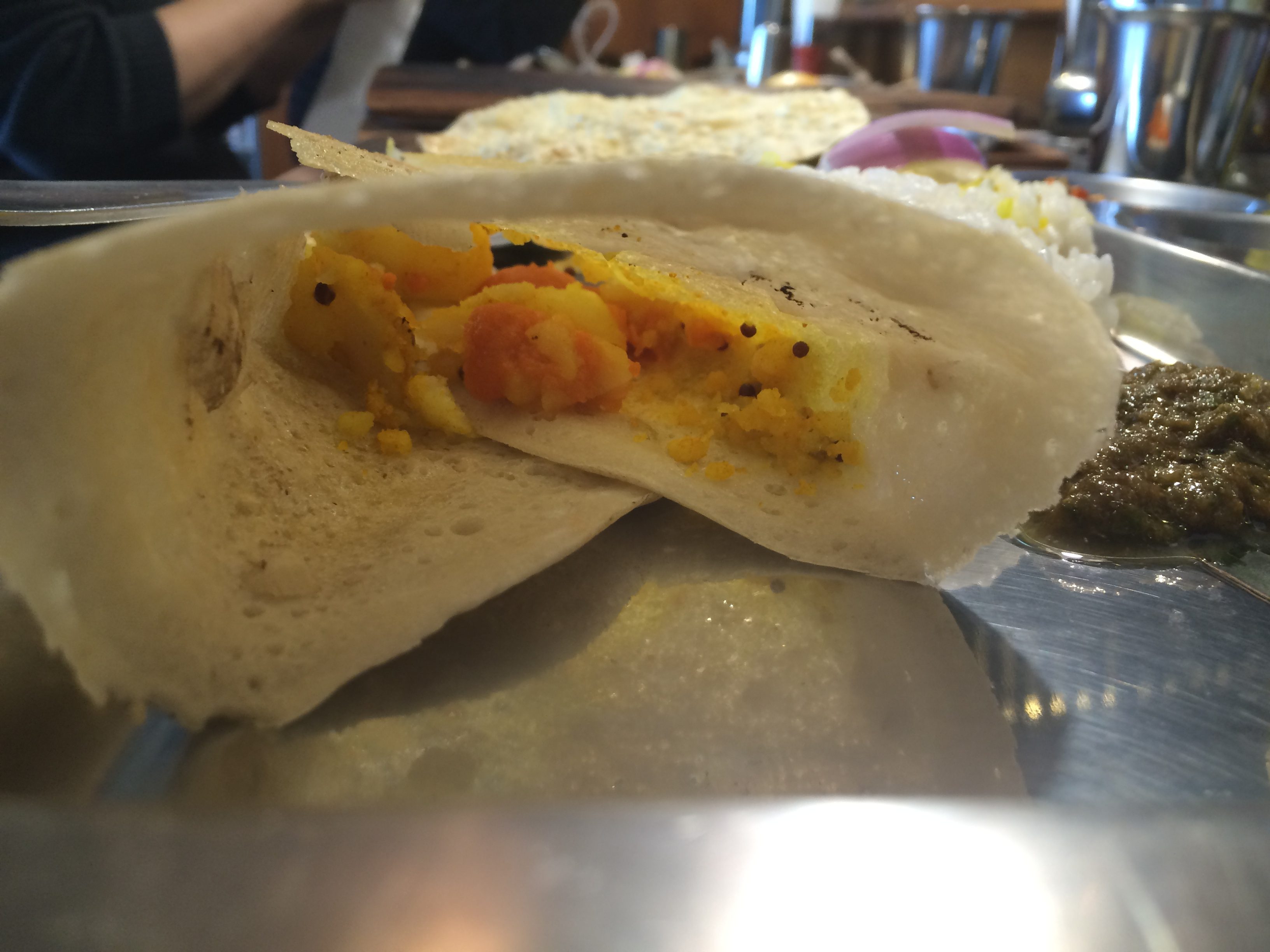 ドーサが目の前にあると気になってしょうがないので食べつくしました。外はパリッとしつつ中はモチ〜としています。