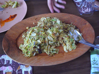 油をあたため、マスタードシード、ウラドダル、チャナダル、カレーリーフ、赤唐辛子、玉ねぎ、塩、レッドペッパー、ターメリック、キャベツ、ココナッツ、塩の順に投入しました。