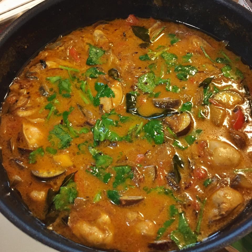 3.ケララフィッシュ風牡蠣(本当は牡蠣のアチャールにしようと思っていた牡蠣ですが、2Lサイズのプリプリッとした牡蠣でしたので、料理として(アチャールも料理ですが・・・)提供したいと思いココナッツミルクシチューと悩みつつ作りました。タマリンドの酸味、ココナッツミルクのマイルドな甘み、ピリッと隠し味の青唐辛子が皆さんの口に合ったようでした。でも本当はもう少し水分を飛ばしたかったんです。ペーパータオルで表面の水分を拭いた後、フライパンで素焼きを試みました。でも50個近い牡蠣さんの保水力は想像以上でした。見る見るうちに水位があがり、牡蠣がぷっくら膨らみ始めてしまい、それ以上炒め続けると水分が抜けすぎてしまう恐れがあるので諦めました。
