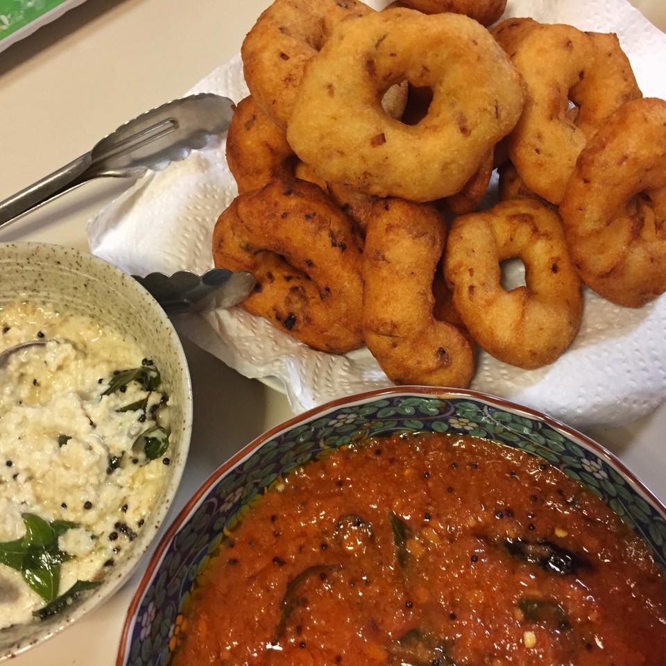 11.蕗の薹ワダ(ウラドダルで作った豆のドーナッツ・ワダに山菜の蕗の薹を入れたもの。ごく少量でも蕗の薹とわかる風味が美味しいと思います。全ての調理が終わった後揚げ始めましたので、揚げたてのものをお楽しみいただきました。ワダは揚げたてが一番美味しいと思います。