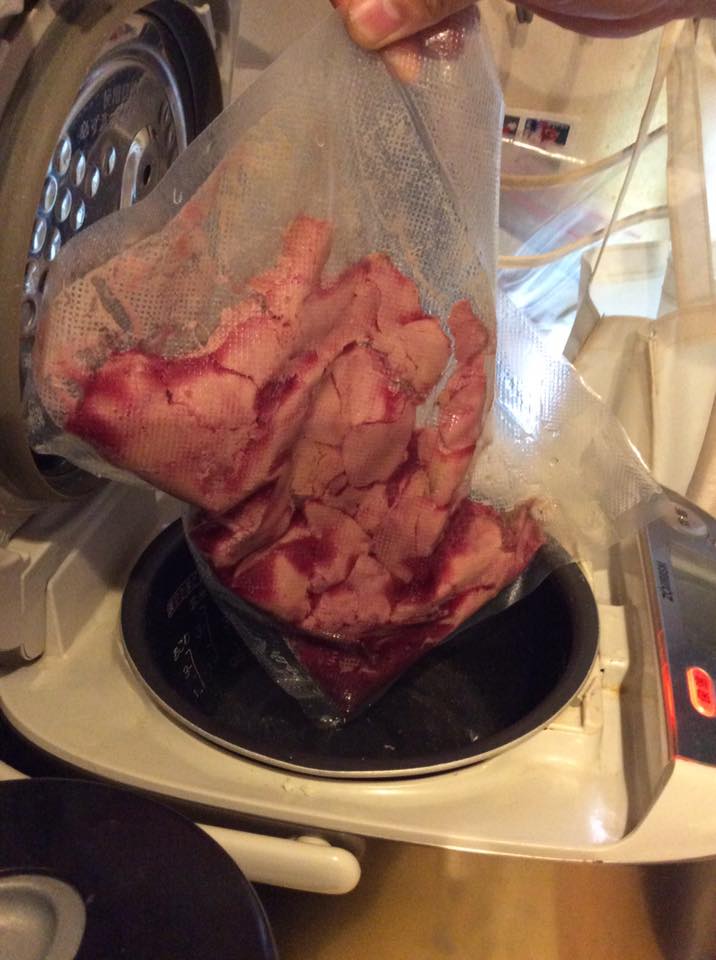 出来る限り真空状態にしたレバーパックとお湯を炊飯器にいれて保温ボタンをポン。