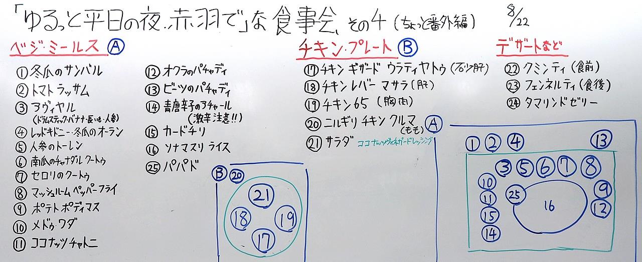 今回の食事会において、会場手配・ホワイトボードの書き込み・配膳手配等仕事帰りにも拘らずお手伝いいただいたSさん、荷物の搬入・食材カット等々お手伝いいただいたSさんをはじめ、配膳、片付け等をお手伝いいただいた皆様、参加いただいた皆様、どうも有り難うございました。