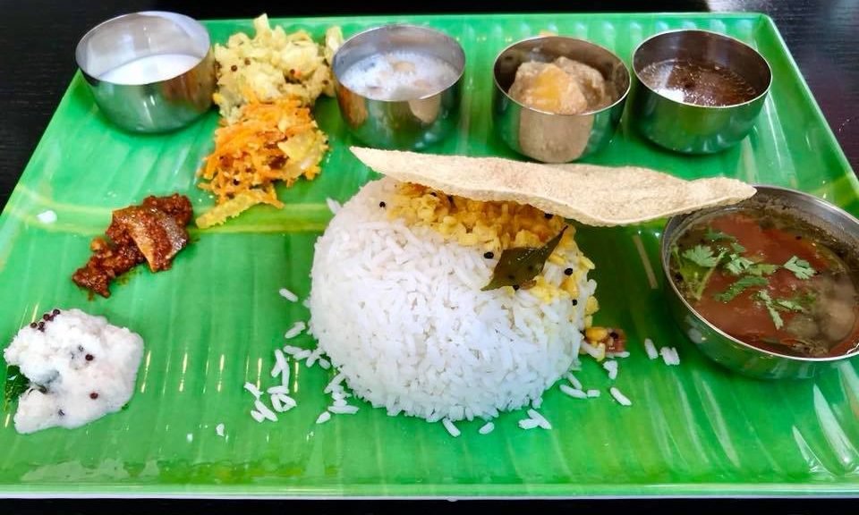 サンバル、ラッサム、柿のクートゥ、オーラン、キャベツのトーレン、人参のトーレン、カード、マンゴーアチャール、ココナッツチャトニ、ライス、ダール