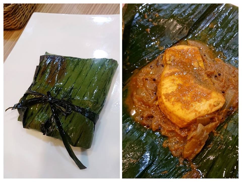 スパイスでマリネしたメカジキをフライパンで焼き、バナナの葉にポリチャトゥマサラを塗った上にメカジキを載せ、さらにポリチャトゥマサラを塗りバナナの葉で包み、蒸し焼きしました。ちょっと面倒な工程の料理です。