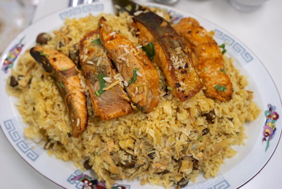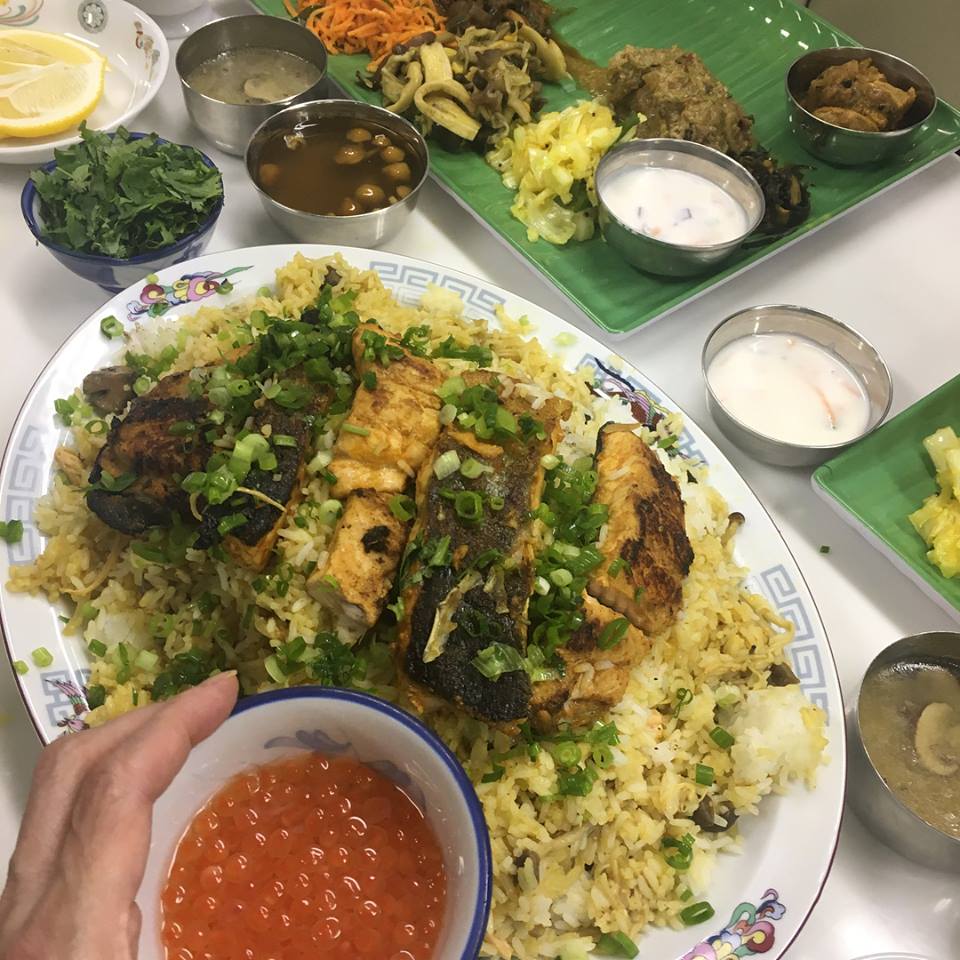 この焼いた鮭を、用意したビリヤニライスに載せて・・・