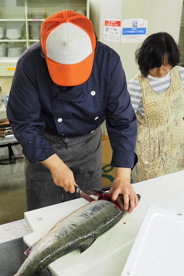 その鮭も、18時過ぎ頃と遅くなりましたが皆さんにご覧いただいたので調理開始です。